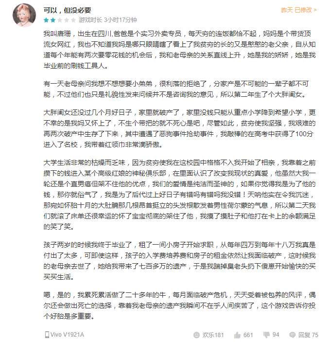 就像一些烂片时差会出现“So bad it's good”的效应,《人生模拟器:中国式人生》糟糕的表现效果结合游戏的主题,形成了不能再天然的喜剧效果,这种糟糕甚至已经成为了游戏特色。但这显然不是开发者的真正意图,他们已经表示在紧急修改中,而游戏最终会成为怎样的存在,也只有交到玩家的手中决定了。