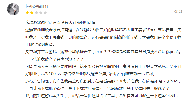 这款游戏叫《人生模拟器:中国式人生》,是一款受到《中国式家长》启发的小制作游戏。很明显,游戏在此前积累了一定程度的期待,导致在开测后获得了大量玩家的反馈。喜感的是,这些差评并非单纯集中在游戏“不好玩”上,而是游戏中匪夷所思的逻辑实在让人哭笑不得,这些评论似乎也带动了更多玩家去下载体验。