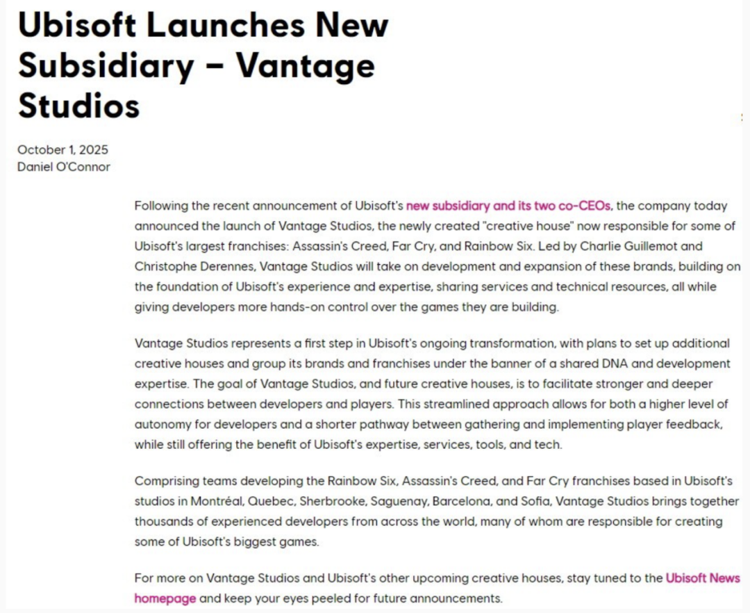 育碧在本周也通过内部邮件向员工通报了科特的离职。育碧发言人表示:“继2025年3月宣布的组织架构重组之后,马克-亚历克西斯・科特选择离开育碧,开启自己新的职业道路。他的离开让我们感到遗憾,但我们相信,我们才华横溢的团队将继承他所打造的坚实基础。”