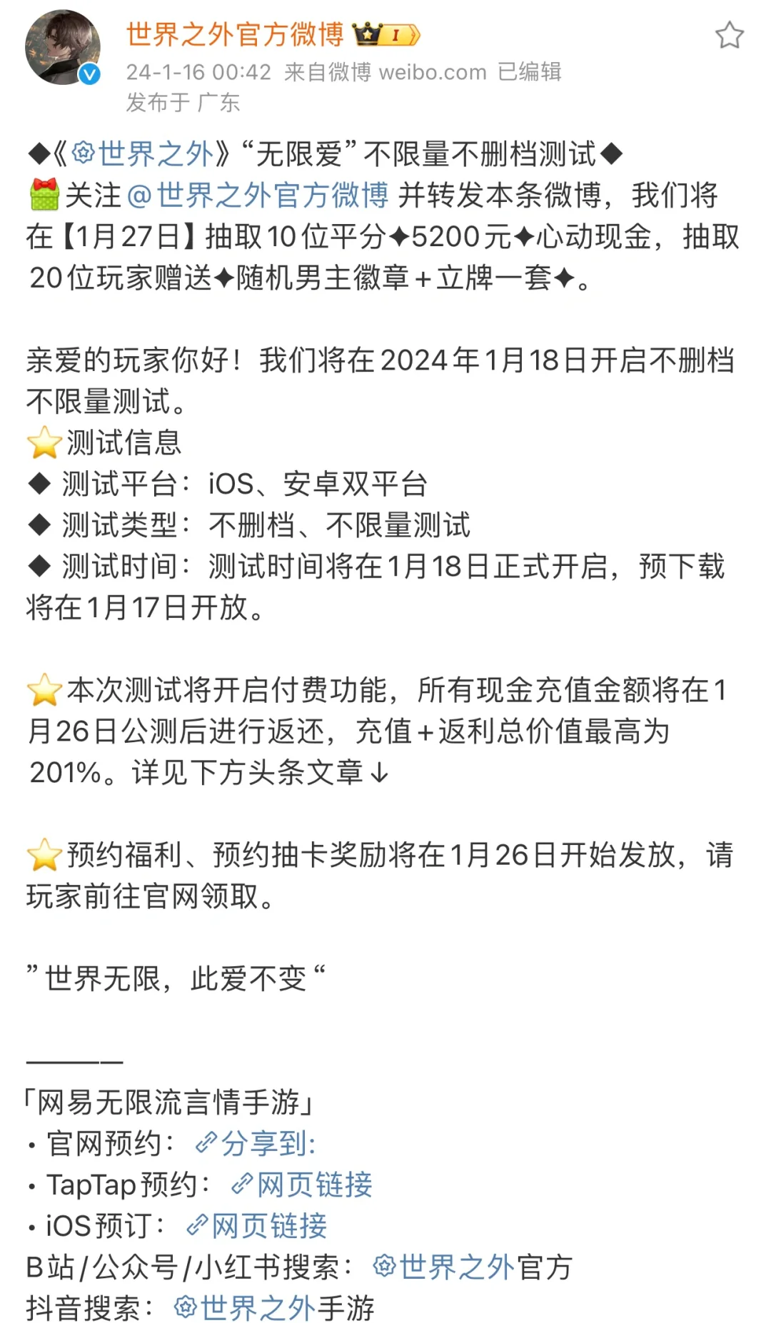 《世界之外》是网易旗下的无限流言情手游,于2024年1月18日正式公测。