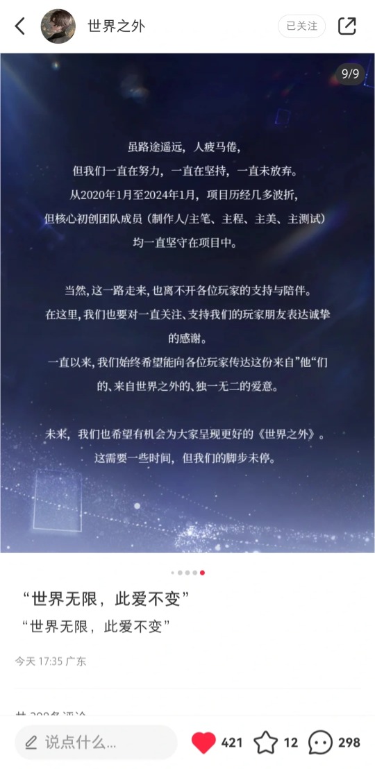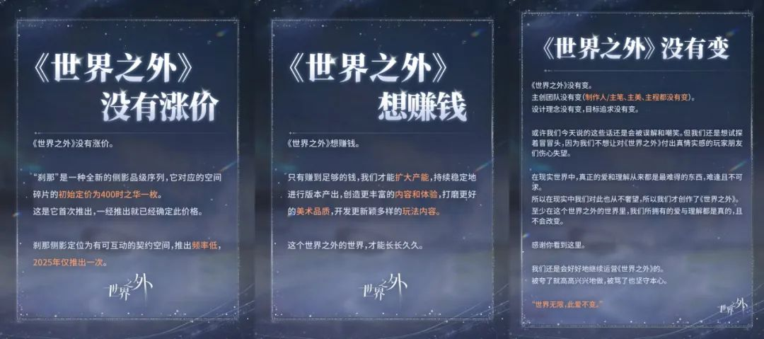 面对负面舆论,团队发布了包括「世界之外想赚钱」「世界之外没有变」「世界之外没有涨价」的三张大字报进行回应,随后万氪玩家收到附带项目组名义手写感谢信的礼盒与后续公告中使用「老板」「老板娘」等称谓,再度引发各种争议。