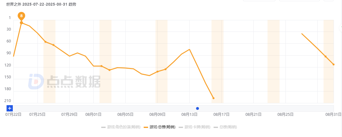 7月23日新版本始至8月末,《世界之外》在iOS畅销榜上一路下滑。