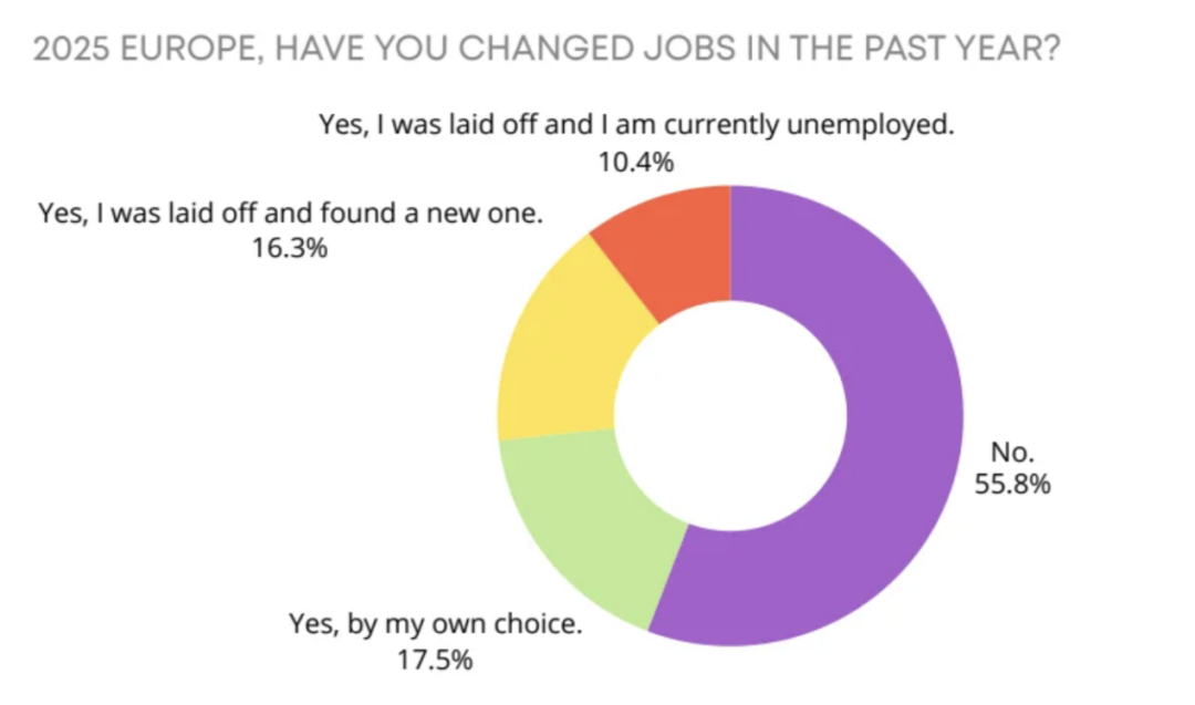 调查显示,过去一年中,欧洲有超过四分之一的游戏开发者遭遇裁员,其中10.4%的人至今仍未找到工作。美术设计、游戏设计与QA专家是受冲击最严重的岗位。