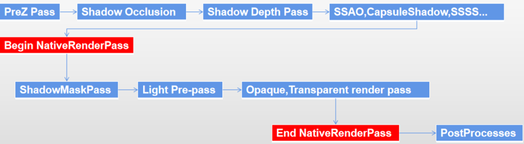 Vulkan版本的管线流程大致如下:首先由PreZ Pass输出Depth,GBuffer与MotionVector,然后计算阴影的遮挡剔除,接着执行阴影的深度渲染,再然后是一些AO和屏幕空间SSS之类的计算然后我们就进入NativeRenderPass,在SubPass中计算ShadowMask,Light Pre-Pass,以及执行正常的Shading Pass。最后退出RenderPass,再执行其他后处理Pass。