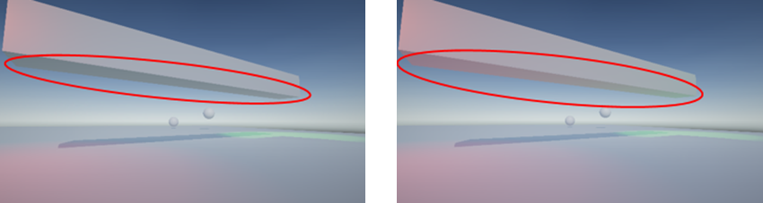 左图使用固定bias值,可以看到box的底部有一段漏光区域,并且与光照方向接近垂直的表面存在部分自阴影走样;使用逐像素bias之后(右图),我们只会在偏导较大的区域增加bias,可以在保持细节投影的同时解决自阴影的走样问题。
