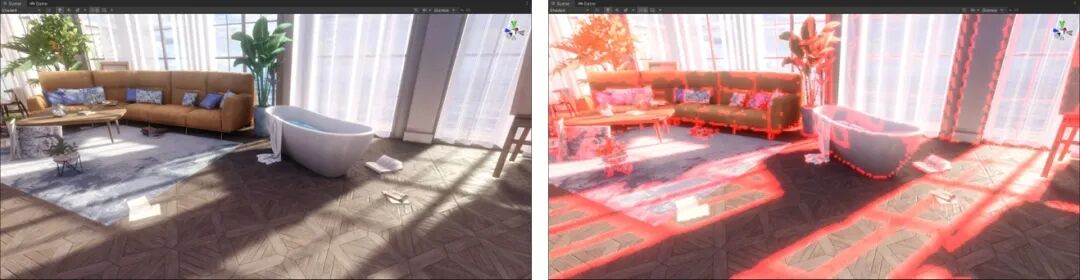 以下为场景的Debug视图,红色区域被我们判定为半影区间,只有这些像素才会执行全分辨率的PCF。