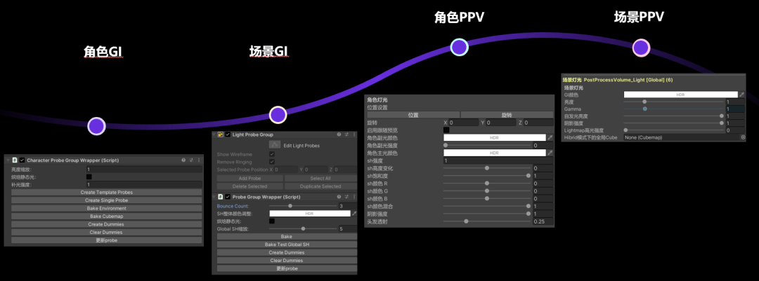 间接光我们使用Unity的LightProbe系统来创建探针,自己实现了保存间接光到探针里的部分,把场景的探针和角色的探针分开两套,分别存储和使用;
