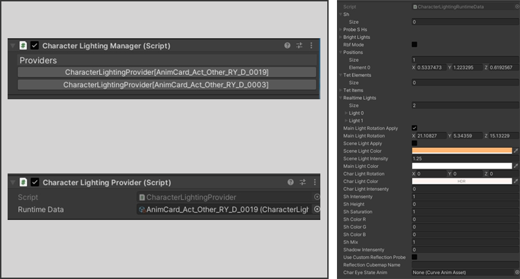 我们把这些影响角色的光照信息存到一个Scriptableobject里,由灯光师调整好之后保存为一个模板;下方右图为角色灯光方案保存的信息,包含了上面提到的两盏平行光,两个额外光,还有探针保存下来的sh,以及一些后处理盒子上可以额外调整的信息和是否使用自定义的反射探针。