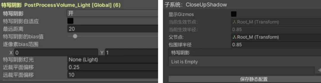 光和影一直都是密不可分的。如前文所提到,我们的阴影方案为三级CSM加特写阴影,实现原理就使用角色身上的一根可指定的骨骼做球心,构成一个指定半径的球,用这个球来构建和生成这张阴影图,在屏幕空间阴影的时候会进行精度比较,使用这张阴影图和级联阴影中精度较高的一张作为这个像素的Shadow Map。