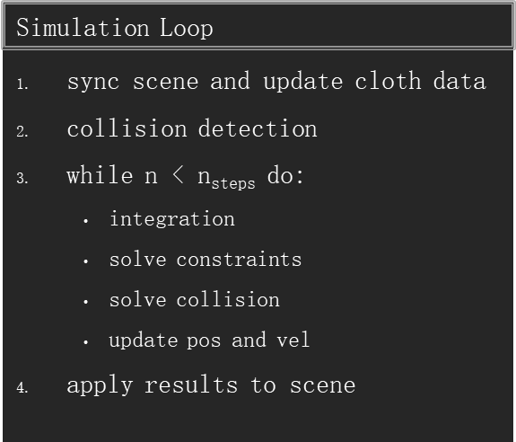 StrayCloth采用XPBD结合sub step的模拟方式。相比PBD,XPBD的优点是摆脱了迭代次数和时间步长的依赖,结合Substep可以显著提升解算的收敛效果。