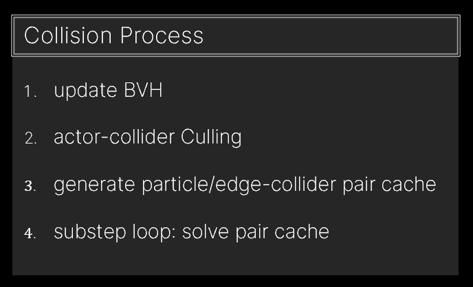 在narrow phase 当中,我们不直接生成contact,而是缓存碰撞体对,在substep中再具体的解决,因为我们采用的sub step的优点,大多数情况下直接使用DCD就可以避免一些快速运动下造成的穿透问题,不需要引入ccd或者predictive contact等一些操作。
