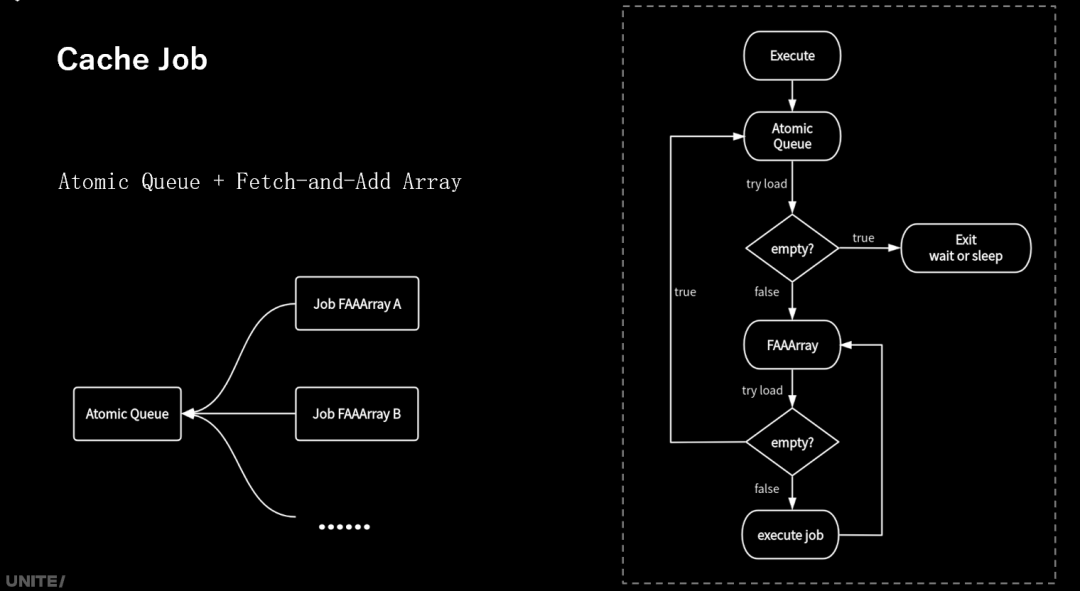 实现上比较简单,因为是一个专用的结构,只考虑一些固定的使用场景。额外添加了一个Atomic Queue用来存cache job,使用fetch and add array 来存具体的job。右边是worker执行cache job的流程示意图。