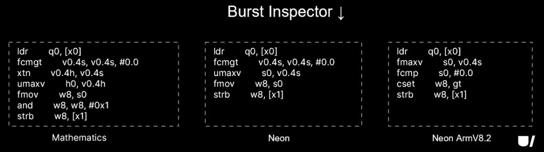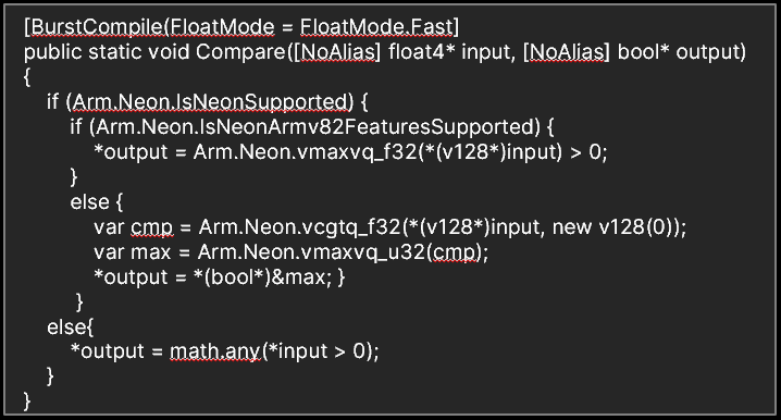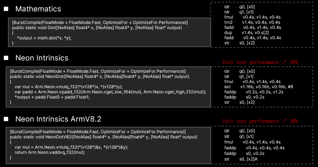 Burst会针对不同平台生成高性能的simd code,在Burst Inspector中可以非常方便的查看。经过检查Burst Inspector和实机测试,在某些场合下也可以通过手写Arm Neon Intrinsics来进一步提升性能。