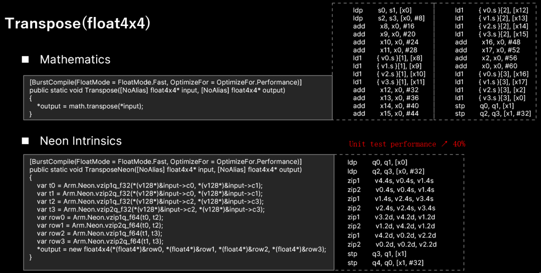 对于转置计算,可以看到mathematics生成的assembly code看起来性能是非常低的,通过手写neon intrinsics, 可以得到一个巨大的性能提升。