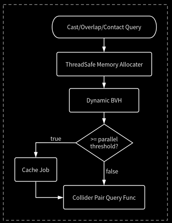 使用基于SAH的dynamic bvh作为broadphase加速结构,在插入、删除以及超出范围的移动时,对当前操作节点的邻近的几个层级节点进行旋转平衡。