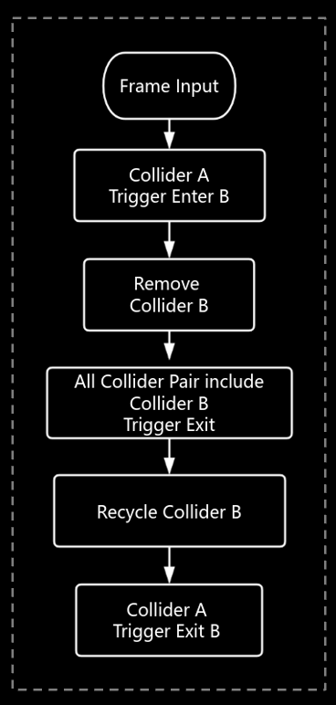 为了满足战斗模块的需求,我们设计了特殊的trigger触发逻辑,Trigger的 Enter 和 Exit必须要成对出现,可以看到以下流程示意图中,在a触发b的函数中移除b后,会触发所有和b存在overlap的collider,这里和unity原生的有所不同——原生的unity中在trigger逻辑中删除掉b是不会触发其它碰撞体的trigger的。最后,我们通过History计数来标记collider的版本,解决复用逻辑可能会导致的一些潜在问题。