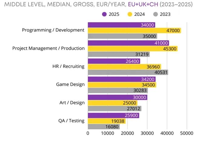 程序/项目管理/人力/策划/美术/测试岗位在近三年的年薪中位数对比(欧元)