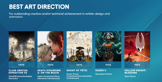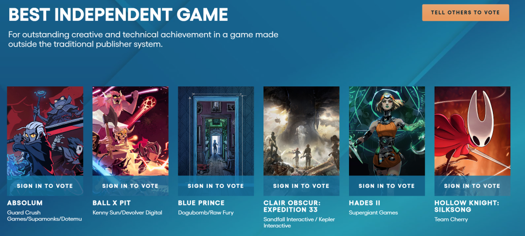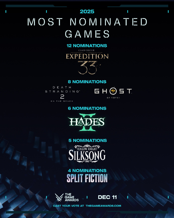值得关注的是,年度最佳游戏提名中首次同时出现两款独立游戏——《空洞骑士:丝之歌》和《哈迪斯2》。但由于TGA将《光与影:33号远征队》也归入独立游戏范畴,这一届的年度大奖实际上可以被视为三部独立游戏同场角逐,颇具划时代意味。