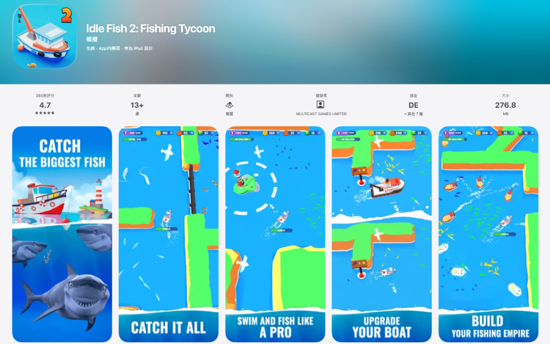 事实上早在2020年,《Fish Idle 2》开发商Multicast Games确实在海外移动市场推出过一款名为《Idle Fish 2: Fishing Tycoon》的手游,并获评2021年最佳放置钓鱼游戏。但风光过后,其下载数一路下滑,此番在Steam崭露头角,可谓二次翻红。
