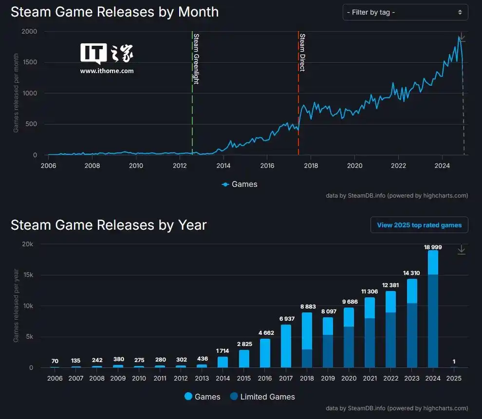 统计数据显示,2024年在Steam平台共计发行了近1.9万款游戏,且每年增量游戏数以千计。尽管当中存在部分质量低劣的产品,却也不乏改变了游戏品类格局的翘楚。