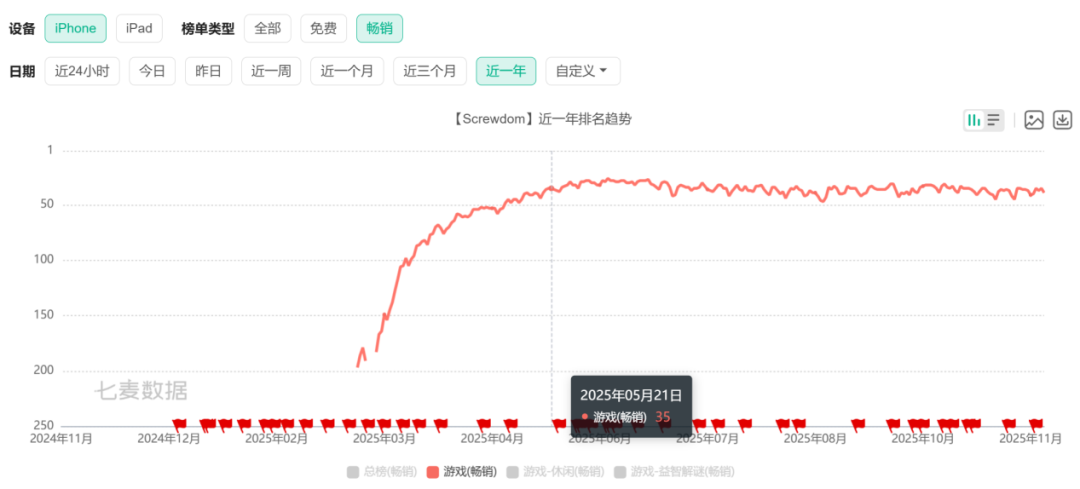 这款“拆螺丝”游戏自2025年5月下旬冲入美国iOS游戏畅销榜Top 35以来,表现异常稳定,至今仍牢牢占据着这一位置,成为混合休闲游戏赛道中又一款“常青树”