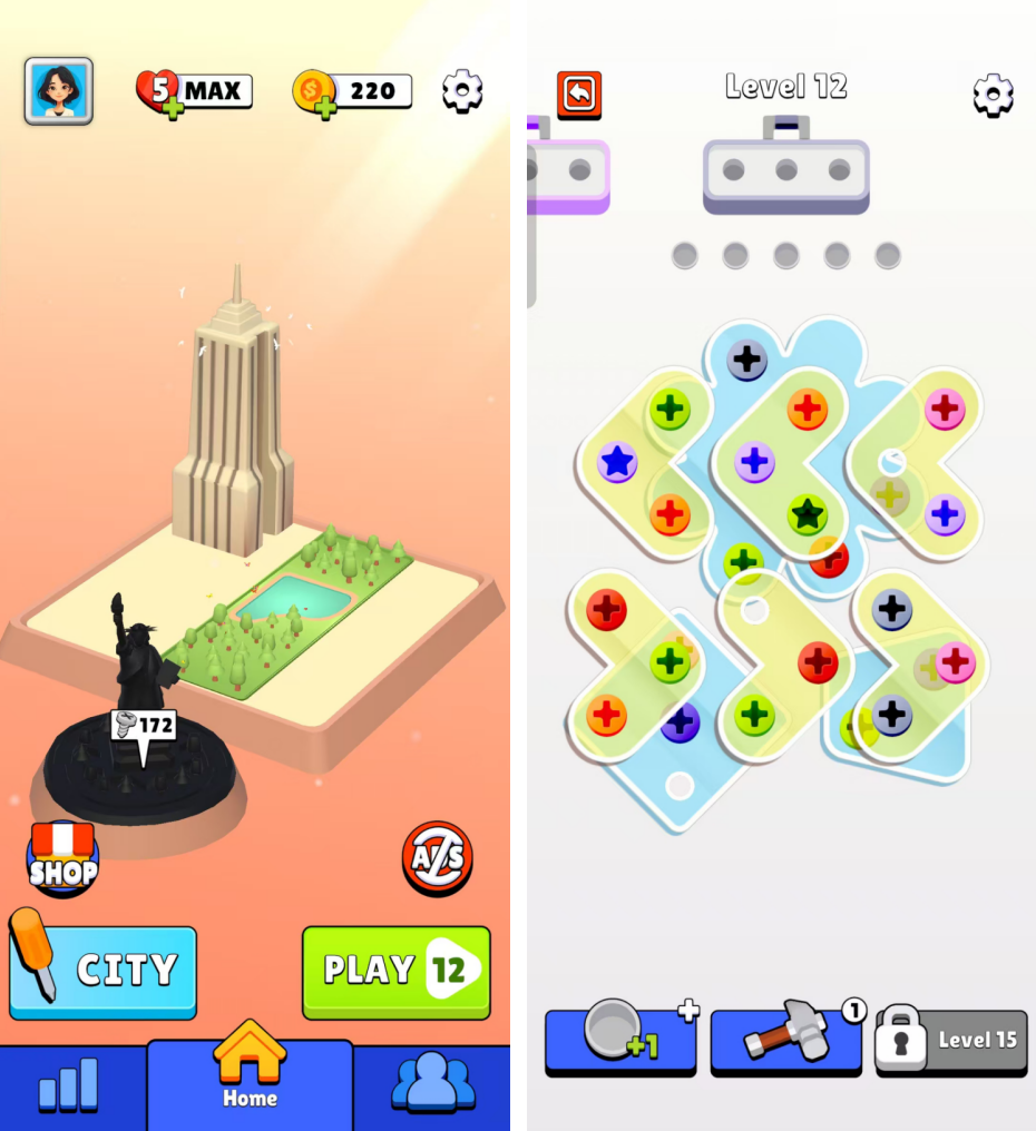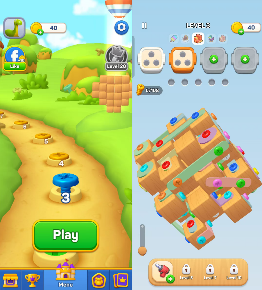 可以说,《Screwdom》的成功源于对玩家心理、空间交互和变现节奏的精准把控,为混合休闲益智游戏领域提供了又一“参照”案例。