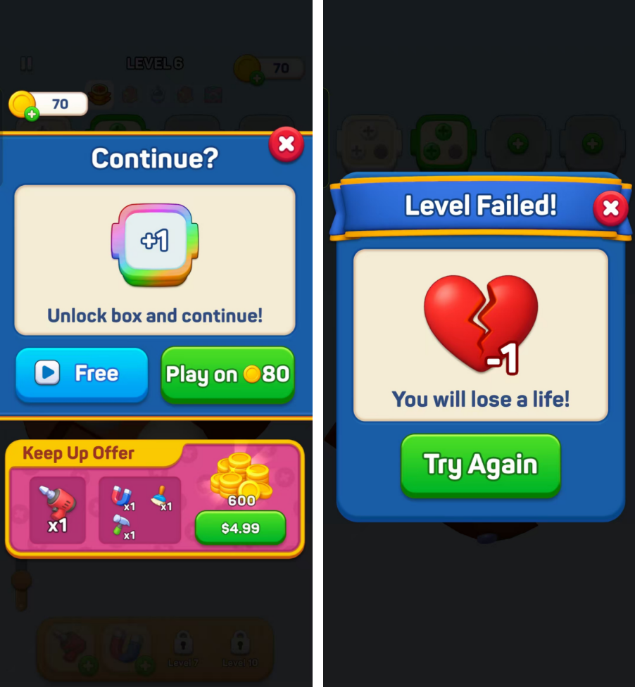 除此之外,《Screwdom》在变现设计上还采用了多重激励策略,比如游戏界面顶部设有两个待解锁的“螺丝盒”广告位,同时在底部道具栏也设置了“观看广告或付费解锁”的机制。这种多管齐下的设计不仅提升了广告曝光机会,更重要的是为玩家提供了切实有效的通关助力,显著提高了用户的过关成功率。