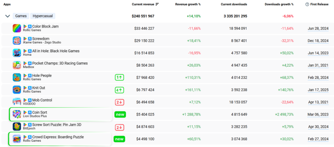 市场数据印证了这一点。AppMagic统计数据显示,2025年前三季度,拆螺丝玩法游戏表现尤为突出,共有三款产品相继进入混合休闲游戏收入TOP10榜单。其中,《Screw Jam》在第一季度表现亮眼,《Screwdom》更是实现持续三个季度的稳定上榜,而《Screw Sort Puzzle》则在第二、三季度成功入围。