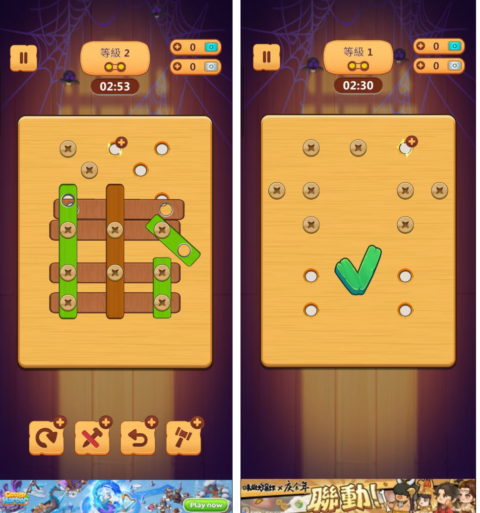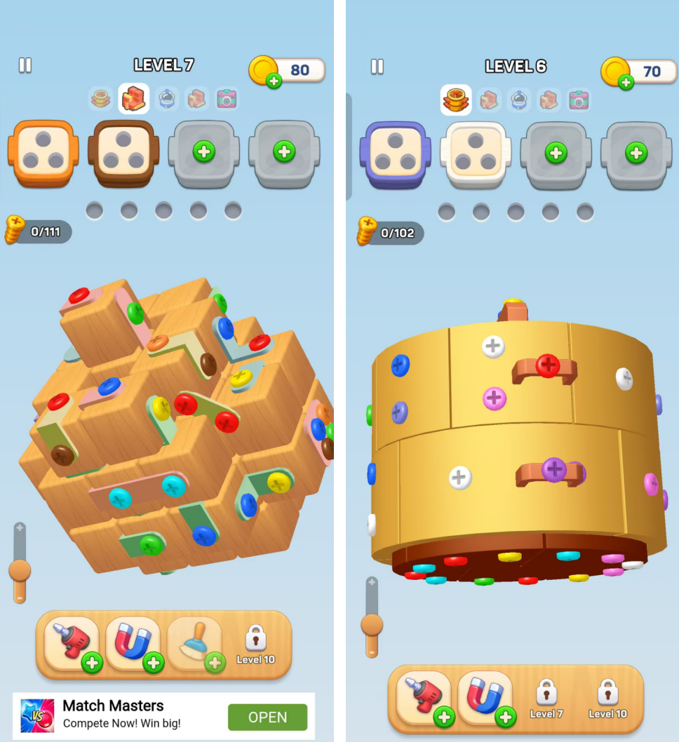 解谜导向的初始阶段:以2023年11月越南ABI Games推出的《Wood Nuts & Bolts Puzzle》为代表。该游戏玩法相对简单:玩家需要转移木片上的螺丝至空孔洞,直至全部木片消除即可通关。