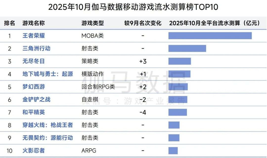 在10月的移动游戏流水测算榜上,上述提到的《王者荣耀》《三角洲行动》《无尽冬日》均凭借出色表现稳居排行榜TOP3。报告显示,10月半数产品排名与上个月持平,其他产品排名变动幅度均未超过5位,头部市场格局相对稳定。