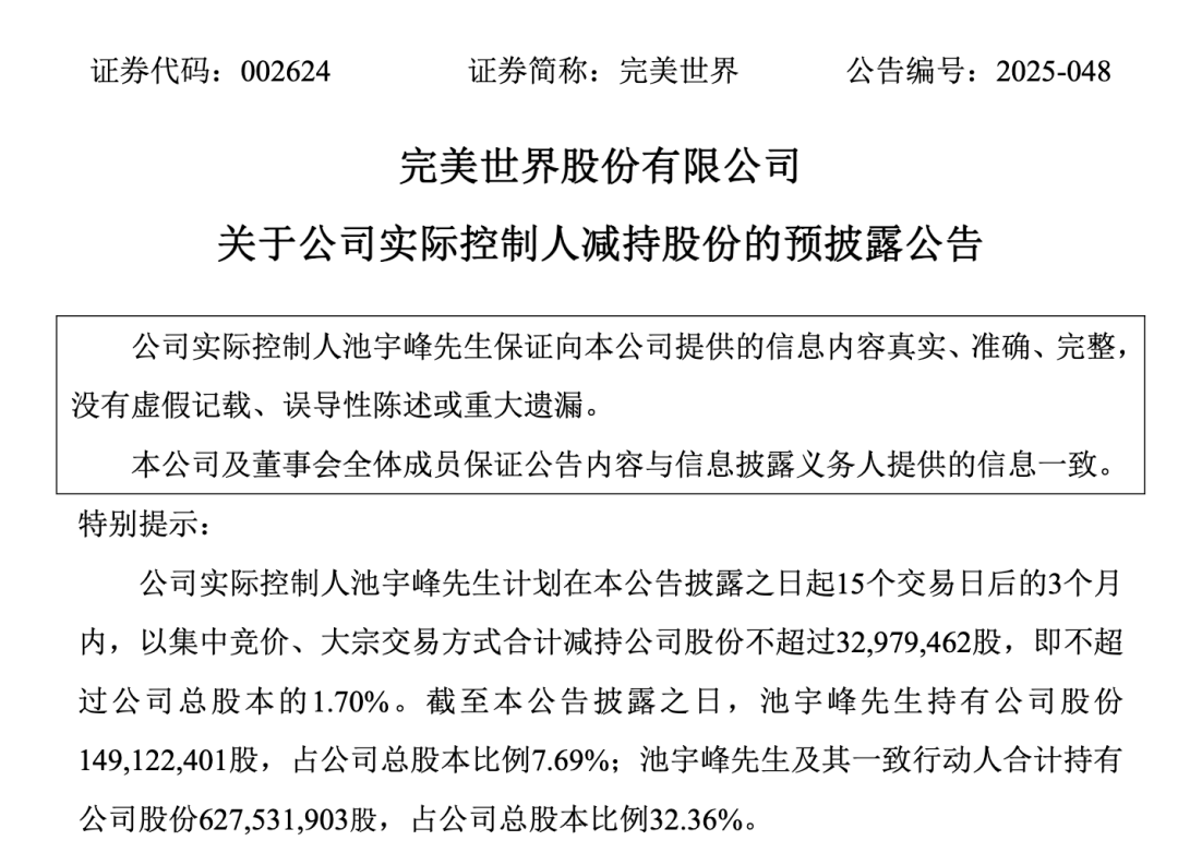 11月27日,完美世界发布公告称,公司实际控制人池宇峰计划在2025年12月19日至2026年3月18日期间,通过大宗交易或竞价交易方式减持不超过3297.95万股,占总股本的1.7%。