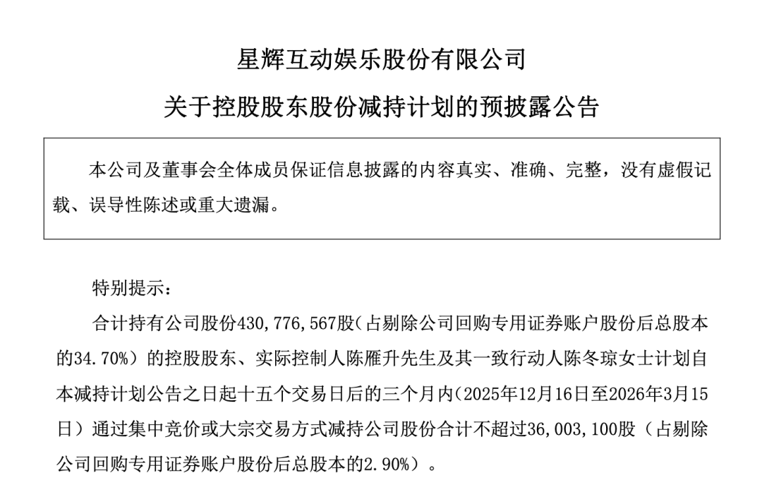 因自身资金需求,陈雁升、陈冬琼计划自减持计划公告之日起十五个交易日后的三个月内(2025年12月16日至2026年3月15日)通过集中竞价或大宗交易方式减持星辉娱乐股份合计不超过36,003,100股。按当时股价估算,陈雁升、陈冬琼本次减持金额合计约为2.13亿元。