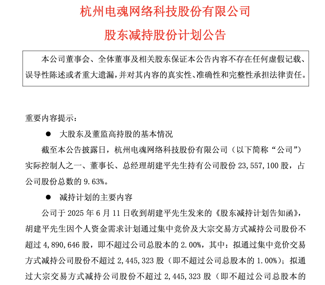 2025年6月11日,电魂网络披露股东减持计划,实际控制人之一、董事长、总经理胡建平拟于2025年7月4日至10月3日通过集中竞价交易或大宗交易方式减持公司股份不超过489.06万股,即不超过其持有股份的20.76%,减持金额上限预计达到1.6亿元。