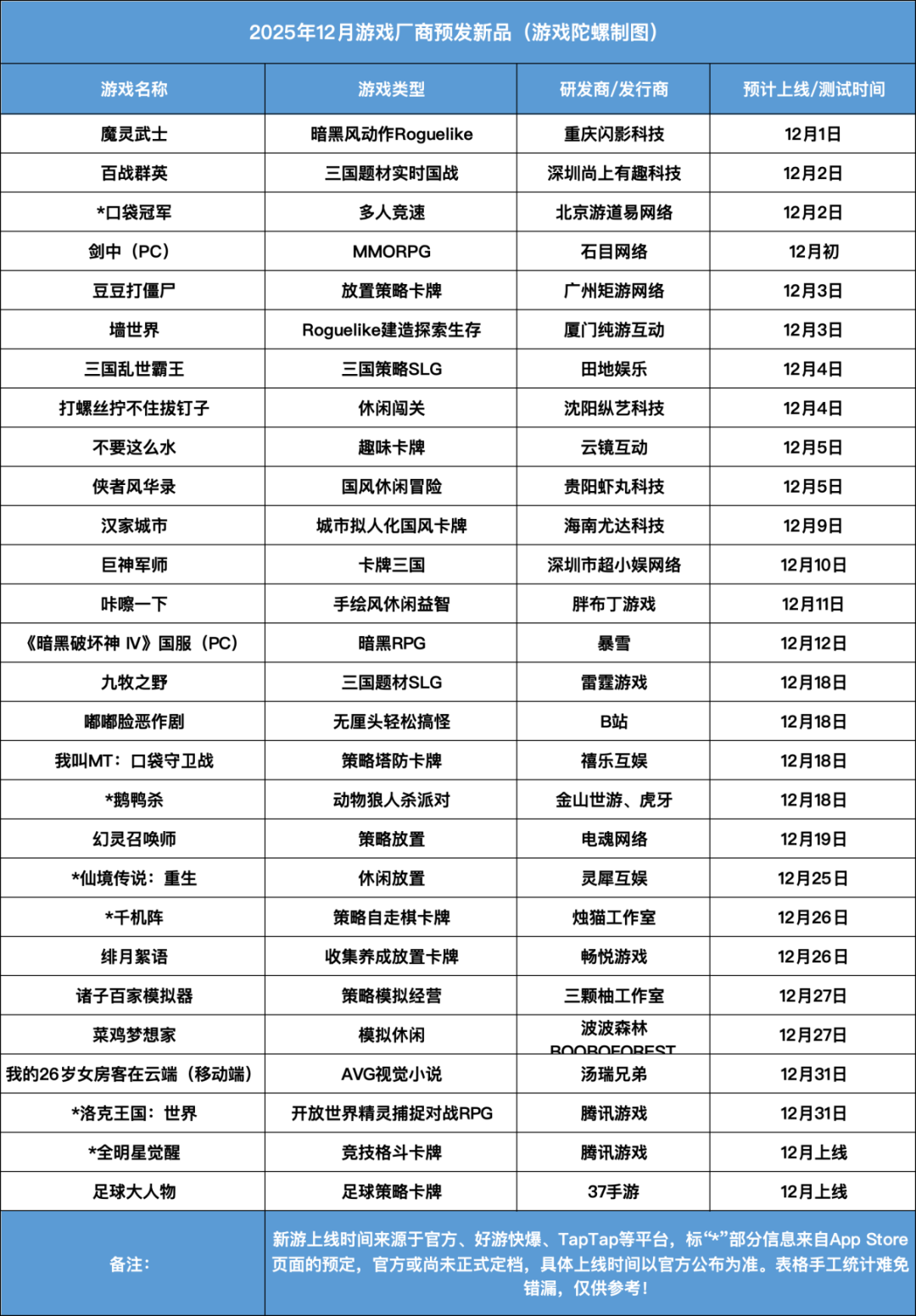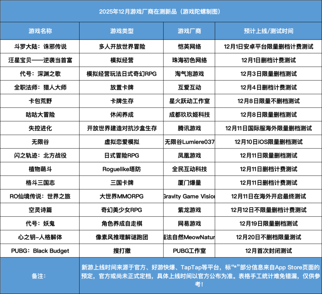 除了已定档的游戏,陀螺君也统计了12月正在测试或将开启限量测试的新游,共计16款。