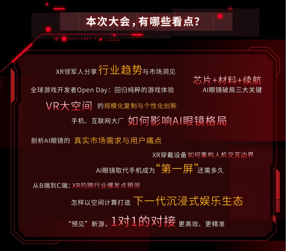2025年,全球VR/AR产业呈现两级分化:光学、材料、显示等底层技术进步显著,AR眼镜在AI加持下加速推向消费市场,形态、应用、场景百花齐放;VR/MR头显虽面临新品荒,但vivo、三星等厂商仍在积极破局,大空间VR市场延续增长,全国体验门店突破1000家。在此背景下,FBEC2025将举办全球VR/AR产业与空间计算论坛,携手行业领导者、技术专家、一线开发者以及用户,共同解析VR/MR的破局之道,以及AR智能化路径与下一代光学技术突破,推动产业务实融合与生态共建。