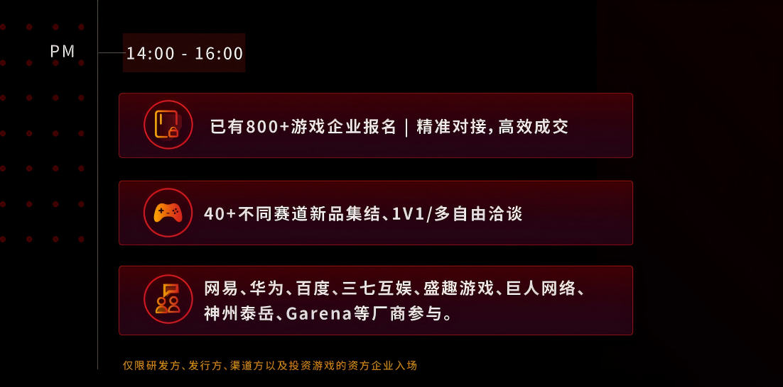 随着技术的迭代和游戏玩家的增长,游戏企业新立项目数量显著提升,行业发展的转折点在逐步来临。在此节点,我们将举办预见新游 · 2025陀螺对接会第2期,旨在为研发商、发行商、投资者提供一个高效高质量的对接交流平台,为更多在研游戏项目以及将上线运营的游戏对接合适的发行和资方,同时我们将向有实力的发行、渠道和投资方发出大力邀请,共同甄选具备全球市场潜力的项目。本次对接会将面向全球招募游戏项目团队,包括不限于移动游戏、出海游戏、PC/独立游戏、AI游戏、小游戏、跨平台游戏、XR游戏等类型,形式上延续1对1、1对多的方式,让行业伙伴与研发团队进行更高效、便捷、有价值的沟通。