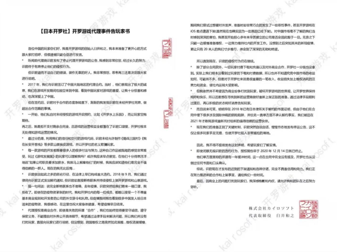 早在2021年10月,开罗社发布告玩家书,公开表示早在 2018 年便已与原中国发行商识君互娱解除合作。但识君互娱却迟至2021年才宣布将结束相关产品的运营,并在2017年起出现多项违约与侵权行为。