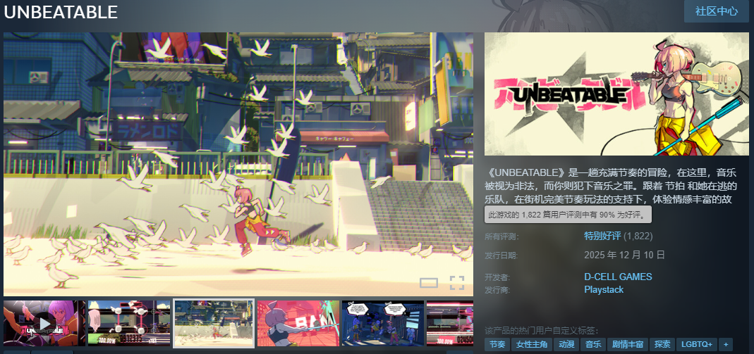 《UNBEATABLE》是一款二次元风格浓烈的节奏冒险游戏,在12月10日正式发布,根据三方平台的记录,发售当天游戏最高曾来到Steam的全球热销榜第6名,发行一周后全球好评率稳定为90%。不过游戏目前还不支持中文,国区在样本较少的情况下好评率为88%。