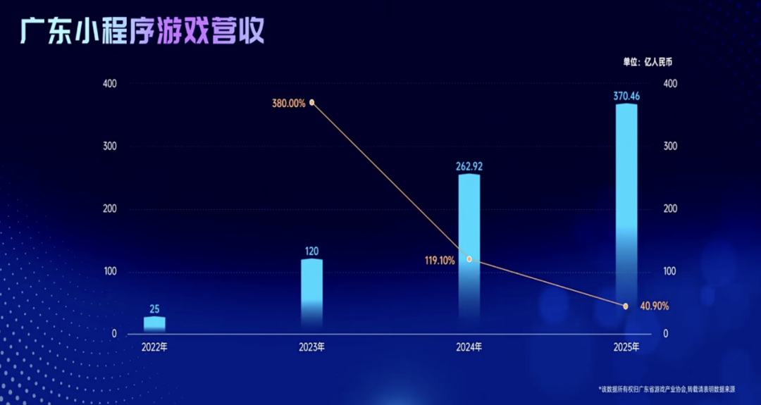真正的“增速引擎”来自小游戏赛道。2025年,广东小游戏营收规模飙升至370.46亿元,同比激增40.90%,占全国小游戏营收的69.20%。它已从“增长点”蜕变为“基本盘”。