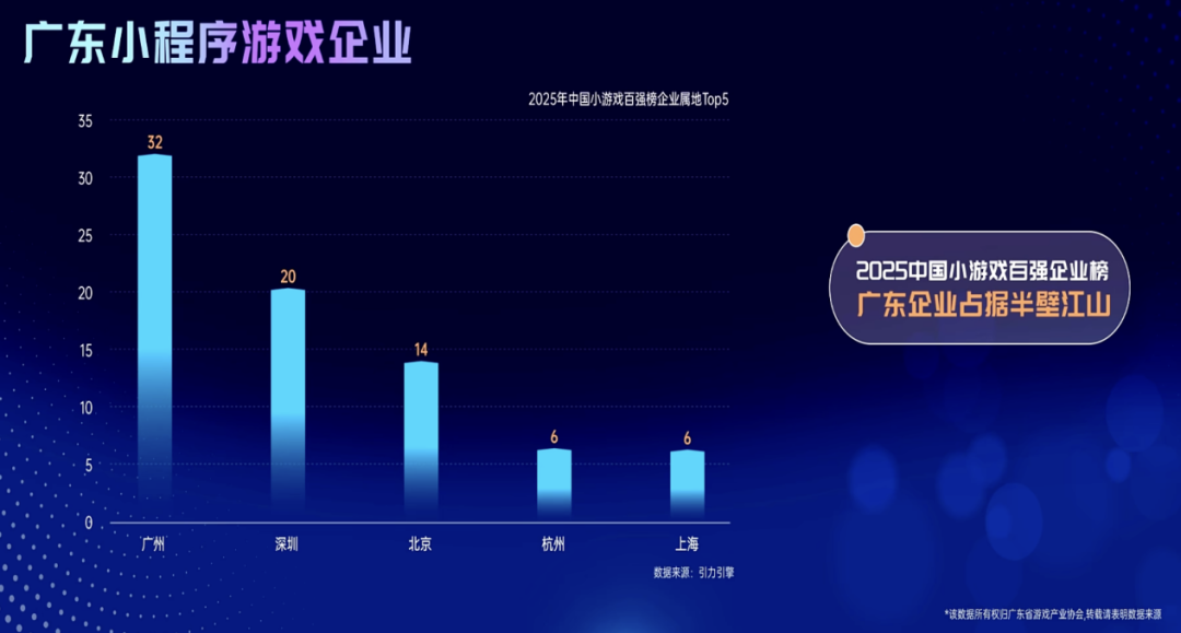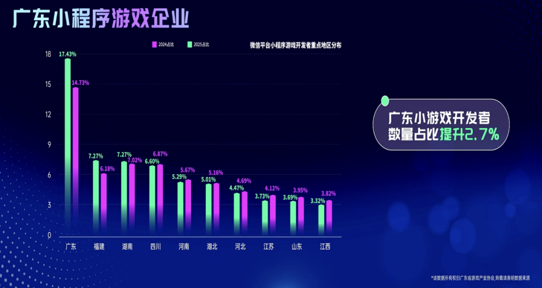 从微信平台小游戏的数据观察,广东小游戏开发者占全国小游戏开发者的比重在17.43%,福建、湖南、四川次之,占比分别为7.27%、7.27%、6.60%。在2025年中国小游戏百强企业榜中,广东企业占据半壁江山。