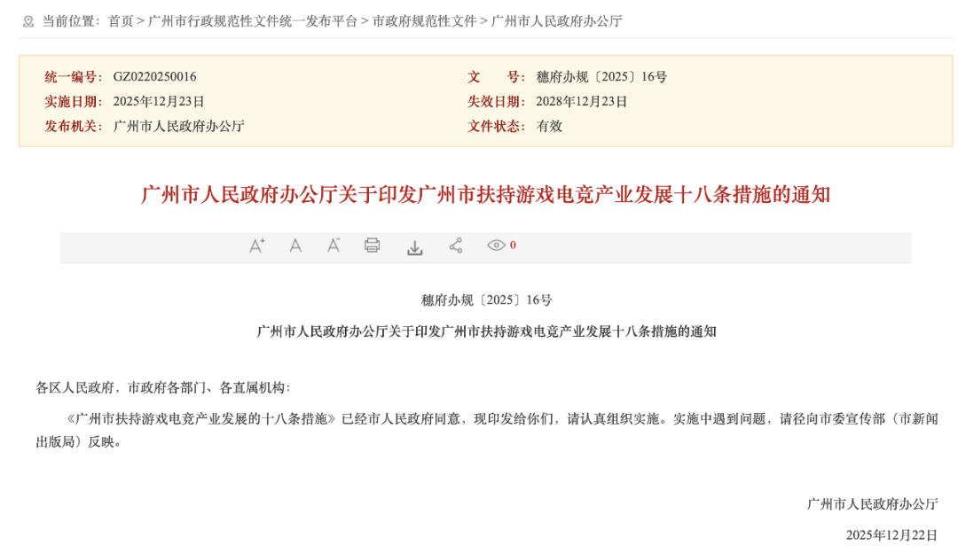 近日,广州市人民政府办公厅印发关于《广州市扶持游戏电竞产业发展的十八条措施》。