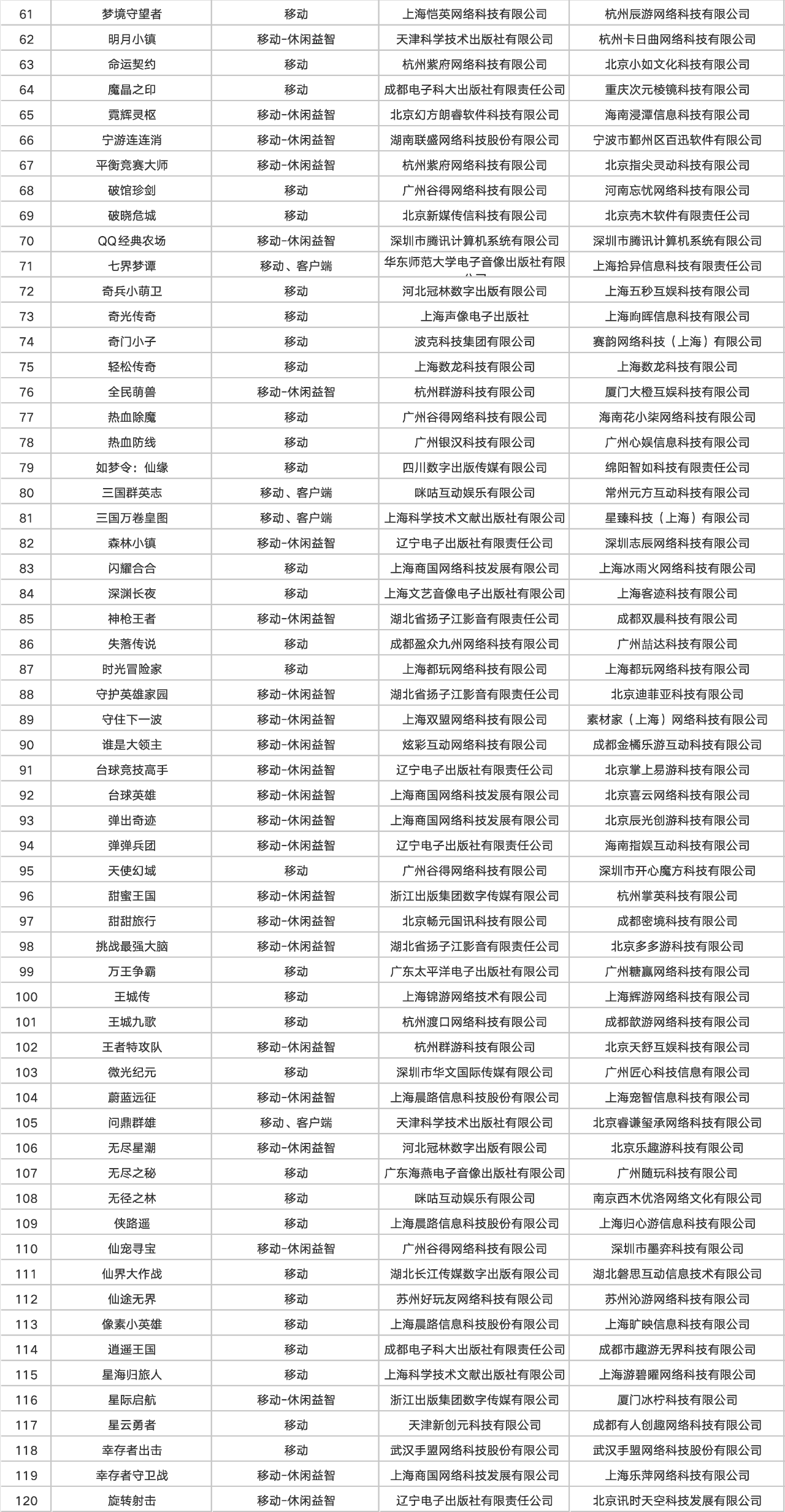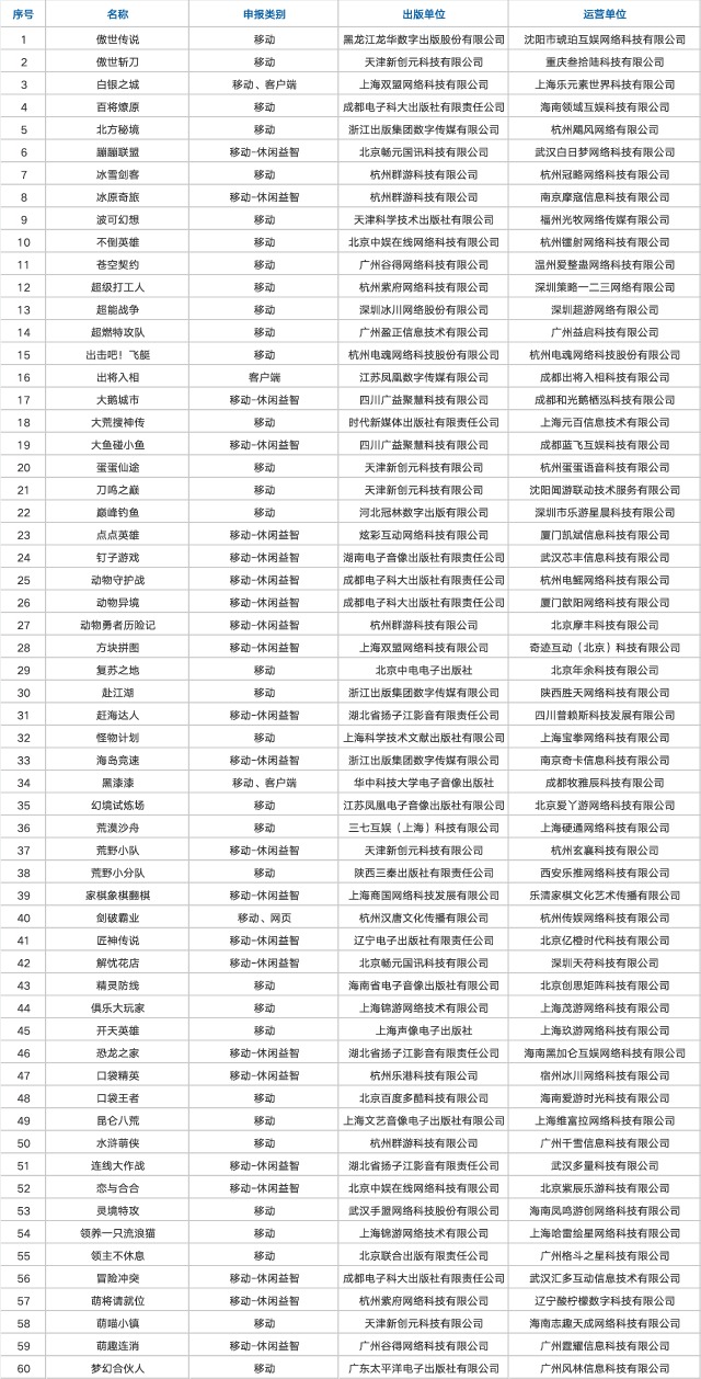 其中,腾讯《QQ经典农场》、上海乐元素《白银之城》、杭州电魂《出击吧!飞艇》、三七互娱《荒漠沙舟》、百度多酷《口袋王者》、广州谷得《萌趣连消》、北京壳木软件《破晓危城》、上海数龙《轻松传奇》、广州银汉《热血防线》、上海恺英《梦境守望者》、广州四三九九《勇者与幻兽》、上海易娱《逐鹿指尖》均获得版号。