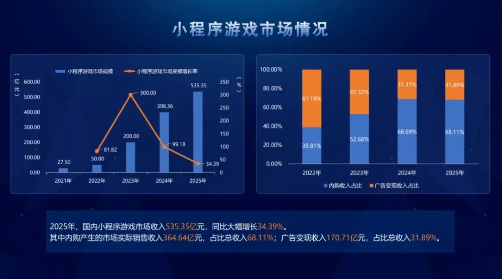 这一趋势与行业整体数据相符——2025年,国内小程序游戏市场规模已突破535.35亿元,同比增长34.39%,其中内购收入达到364.64亿元,占比接近70%。
