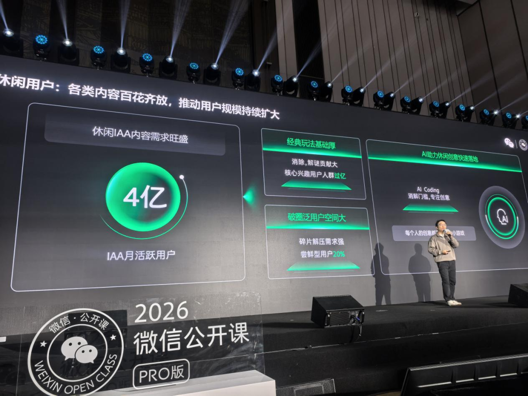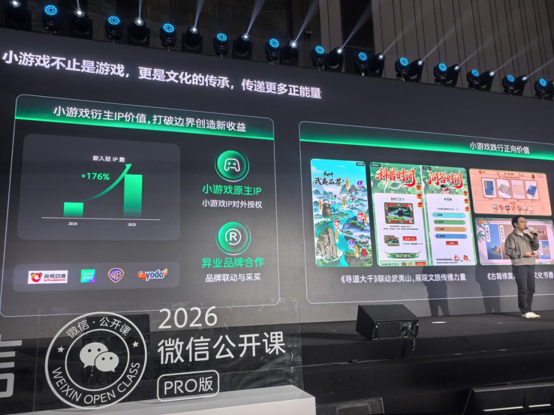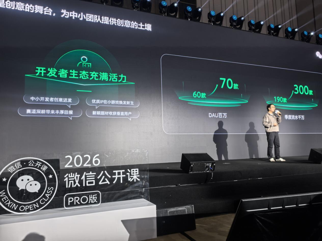 1月15日,“2026微信公开课PRO”于广州举行。微信小游戏产品总监李卿在会上做了主题演讲,回顾了小游戏平台九年的发展历程,并分享了过去一年微信小游戏的多组重要数据。