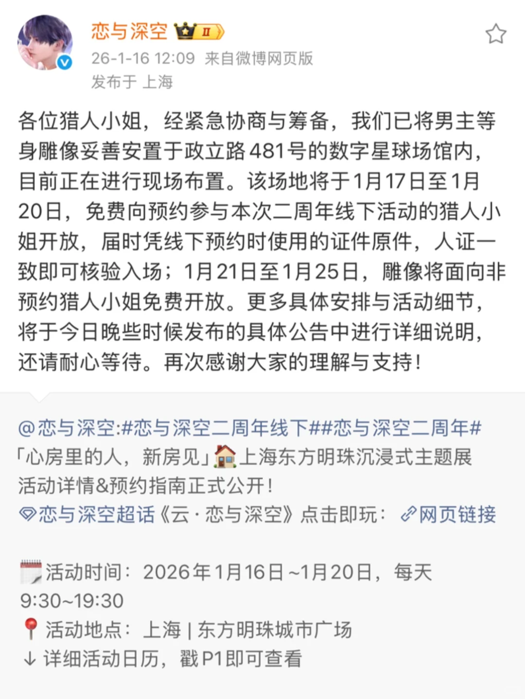 念念不忘,必有回响。在二周年节点上,《恋与深空》把这场预谋了两年的重逢真正落到了现实里。从上线之初的企划埋线,到此刻等身雕塑的落成,爱跨越光年,触手可及。