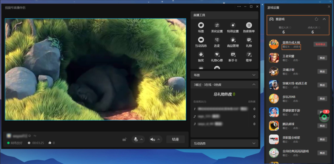 在视频号,游戏直播转化逻辑其实非常直接,用户被直播内容种草,点击下方的“推游戏”组件,就能直接跳转到对应的小游戏。这种“看直播-点击-玩游戏”的链路极短,几乎不存在门槛和跳转流失。