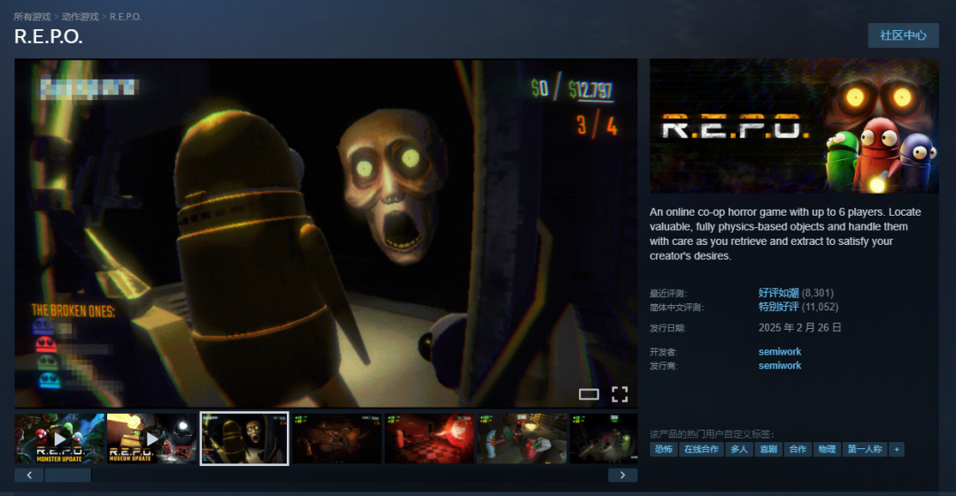 在PC游戏市场,《REPO》《致命公司》《前方高能》等“轻度恐怖、重度社交”的微恐产品持续火爆,凭借合作生存、趣味整蛊等特点,成为主播直播与玩家开黑的首选,彻底打破了传统恐怖游戏小众硬核的标签,推动微恐品类走向主流。