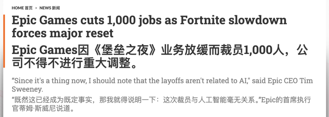 Sweeney承认,企业裁员的问题更多地还是出在Epic Games本身。
