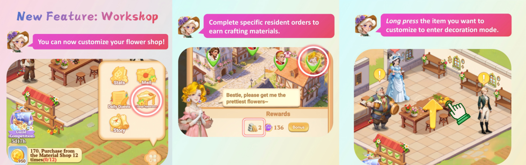 产品在玩法和内容层面上,并没有太大的改动,《My Garden Tale》基本把国内的玩法和美术素材原封不动搬到了国外。游戏的核心体验依然是扮演遭遇丈夫背叛的古代主妇,通过播种、浇水、收割花朵来制作花艺并完成顾客订单,进而解锁后续的逆袭剧情。