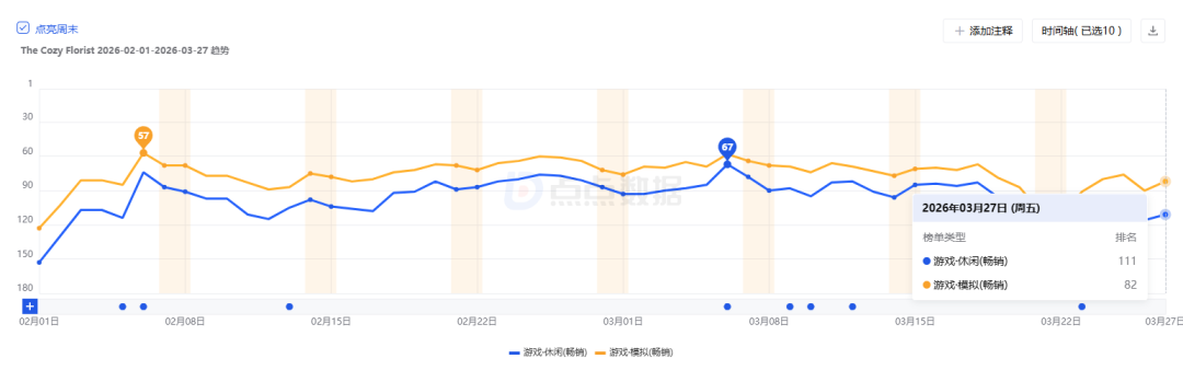 根据AppMagic的数据显示,这两款游戏在2月份同时出现在了出海收入增长榜上,《我的花园世界》排在第14名,而《The Cozy Florist》则排在第16名。